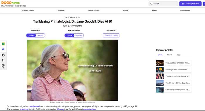 نمونهای جذاب: مقاله در مورد مرگ دکتر جین گودال (https://www.dogonews.com/2025/10/7/trailblazing-primatologist-dr-jane-goodall-dies-at-91) که ایدههایی برای حفاظت از حیات وحش میده، یا خبر “لیلی آبی ۱۸۳ پوندی” (https://www.dogonews.com/2025/9/30/water-lily-weigh-off-winner-holds-astonishing-183-pounds) که قدرت گیاهان رو نشون میده. این سایت برای دانشآموزانی که وقت کمی دارن عالیه، چون هر خبر مثل یک داستان کوتاهه.